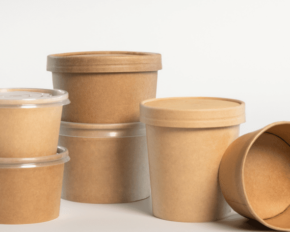 Gobelets en kraft brun biologique avec couvercle plat en carton ou en plastique, parfaits pour l'emballage durable de plats chauds et froids.