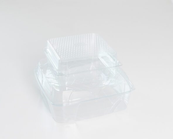 Plastic presenteerschotels met transparant deksel, goed afsluitbaar en stapelbaar. Ideaal voor traiteurs en catering.